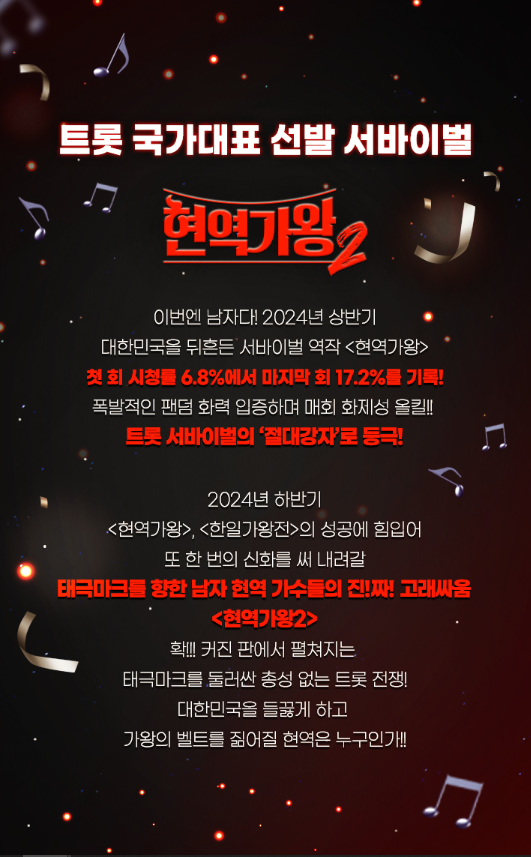 2024년 첫 회 시청률 6.8%에서 마지막 회 17.2%를 기록하며, 엄청난 화제를 일으킨 현역가왕이 이번에는 남자 편으로 제작되어 태극마크를 향해 또 한 번 트롯전쟁이 펼쳐지는데요.