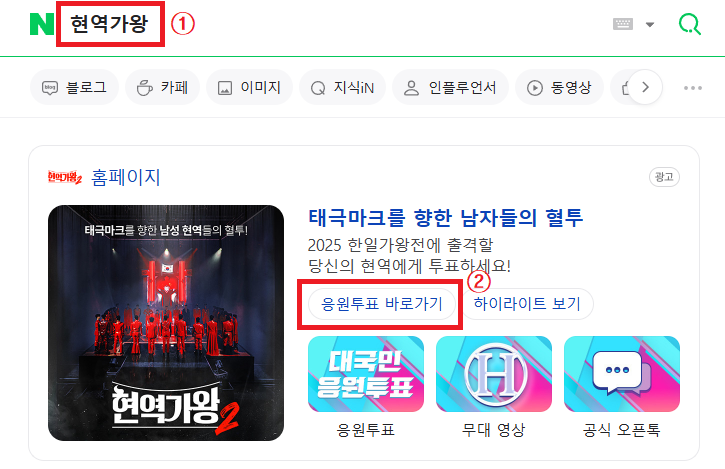 먼저, 네이버 검색창에서 '현역가왕'을 검색한 후 '대국민 응원 투표' 버튼을 누르고, 응원하는 현역 7명을 선택하시면 됩니다.
