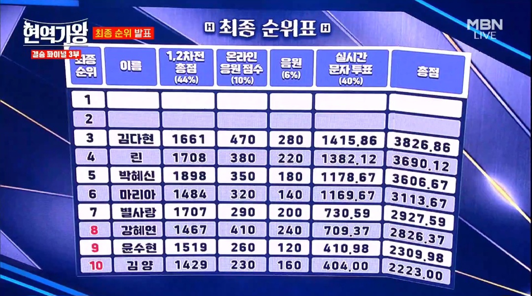 8위는 강혜연, 9위는 윤수현, 10위는 김양으로 아쉽게 탈락했습니다.