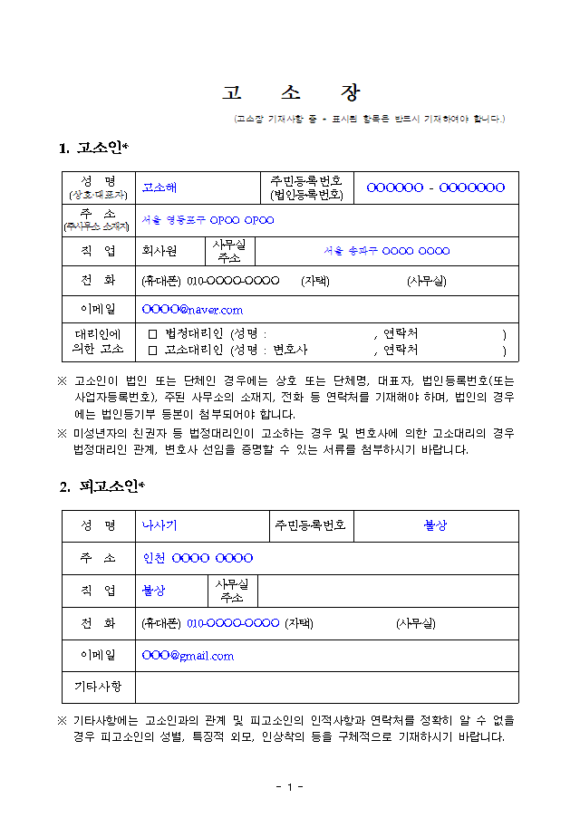 고소장 무료 양식