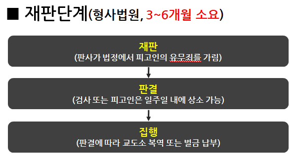 형사법원을 통한 재판단계도 수사단계와 마찬가지로 보통 3개월에서 6개월 정도 기간이 소요됩니다.